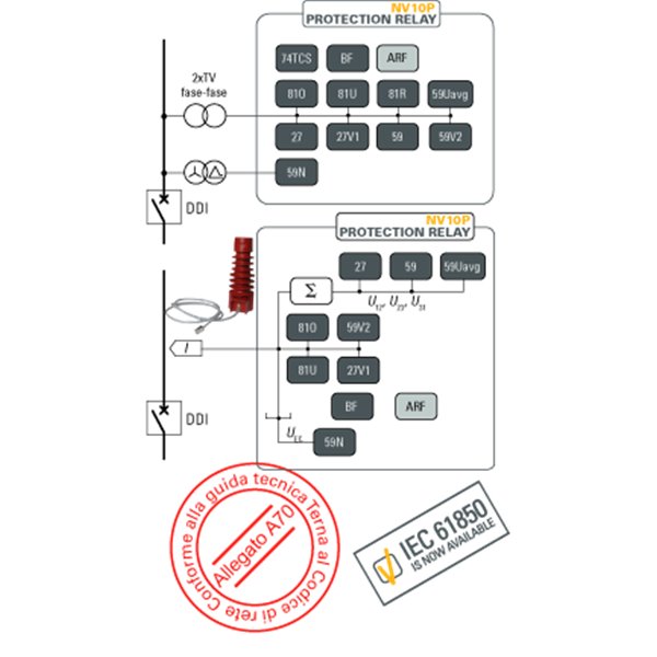 Applications • Bus • Generator • Motor • Utilities interconnection Protection functions • Pt100 thermometric probes (26) • Undervoltage (27) • Positive seq. undervoltage (27V1) • Overvoltage (59) • Residual overvoltage (59N) • Average overvoltage (59Uavg) • Negative seq. overvoltage (59V2) • Frequency rate of change (81R) • Underfrequency & overfrequency (81U 81O) • Breaker failure (BF) Monitoring and control functions • Automatic recloser for photovoltaic plants • CB diagnostic • Digital Fault recording (DFR) • Fault and event logging (SER & SFR) • Multiple setting profiles • Programmable Logic Controller • Self-test • Trip circuit supervision (74TCS) Hardware • 100 V standard voltage inputs • 2 binary inputs + 6 output relays + 8 LEDs • 400 V standard voltage inputs • Auxiliary power supply 110-230 Vac/dc • Auxiliary power supply 24-48 Vac/dc • Flush, projecting, projecting, rack, with separate MMI • Network module with Ethernet FX port (optical fiber) • Network module with Ethernet TX port (copper RJ45) + RS485 port • RS485 port (unavailable with Ethernet FX port) • Voltmetric inputs from ThySensor or V-sensor Communication • IEC 61850 Protocol • Modbus RTU RS232 protocol • Modbus RTU RS485 / IEC 870-5-103 / DNP3 protocol • Modbus TCP/IP protocol (network board must be provided)
