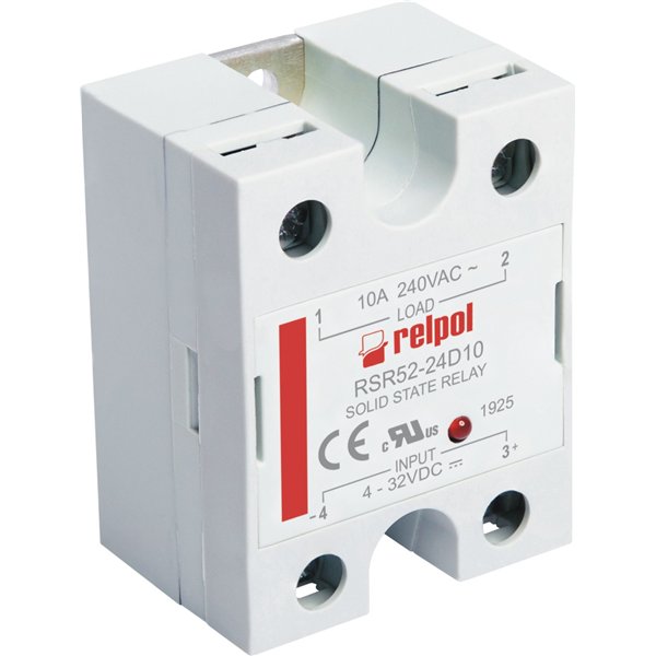 Single-phase sold state relays, industrial RSR52-24A25, zero-crossing or random-on switching, load voltage 240 V AC, control input 90…280 V AC. Obciążenie znamionowe AC1 - 25/240 V AC