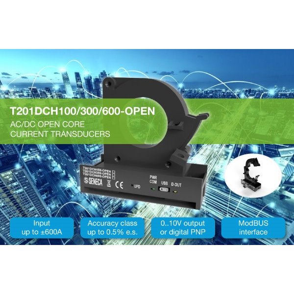Seneca élargit encore la gamme T201 de transformateurs de courant à effet Hall avec le T201DCH600-MU, un convertisseur de courant TRMS bidirectionnel qui peut mesurer à la fois les courants CA et CC. Le T201DCH600-MU peut convertir un signal de courant jusqu'à 600 A en un signal 0..10 Vdc ou un contact d'alarme numérique (PNP). De plus, l'onduleur dispose d'une communication Modbus RS485. La configuration se fait avec des commutateurs DIP ou le logiciel gratuit Easy Setup de Seneca.