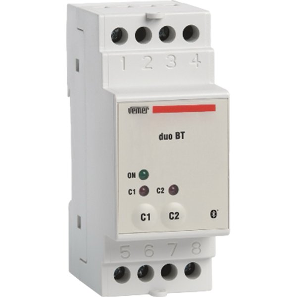 Le duo BT est logé dans un boîtier 2 modules DIN, doté de touches frontales pour la commande manuelle ou la réinitialisation, ainsi que de voyants LED indiquant l’état des relais et la connexion Bluetooth. Un compartiment arrière avec couvercle permet un remplacement rapide et sûr de la pile.