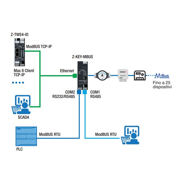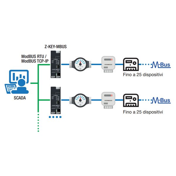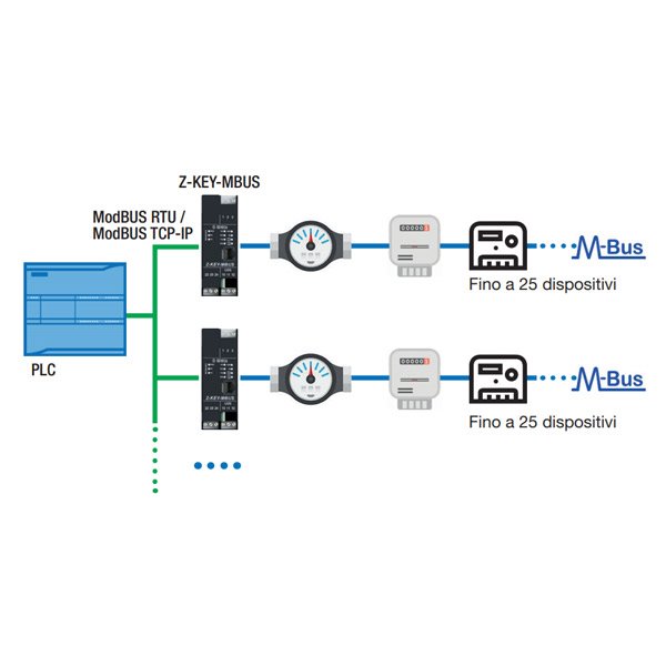 M-BUS est le bus principal utilisé pour le comptage d'énergie et la gestion intelligente des compteurs, c'est-à-dire l'enregistrement séparé de la consommation de chaleur, d'eau, d'électricité et de gaz. Z-KEY-MBUS est un convertisseur capable de lire, convertir et transférer des données de ModBUS RTU / TCP-IP vers jusqu'à 25 instruments Meter-BUS et vice-versa. Il intègre un port Ethernet, deux ports série, un port micro USB et un port M-BUS.