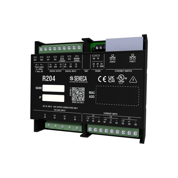 Le wattmètre triphasé R204 accepte les entrées de mesure de courant pour les TC avec sortie courant / tension, les capteurs VT et Rogowski (avec sortie de tension jusqu'à 333 mV), avec des types d'insertion monophasés, triphasés 3/4 fils et avec le support des protocoles ModBUS RTU, ModBUS TCP-IP, Peer-To-Peer. Comme la plupart des produits de la série R «peu encombrants», le R203 dispose de 2 ports Ethernet qui peuvent également être utilisés pour les connexions en série en guirlande avec protection de contournement automatique.