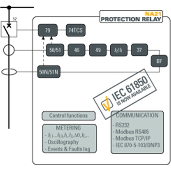 Applications • Feeder • Transformer Protection functions • Pt100 thermometric probes (26) • Phase undercurrent (37) • Negative sequence overcurrent (46) • Thermal image (49) • Phase overcurrent (50/51) • Residual overcurrent (50N/51N) • Automatic reclosing (79) • High impedance restricted earth fault (87NHIZ) • Breaker failure (BF) • Phase interruption under low-load condition (I2/I1) Monitoring and control functions • CB diagnostic • Cold Load Pickup (CLP) • CTs monitoring (74CT) • Digital Fault recording (DFR) • Fault and event logging (SER & SFR) • Logic selectivity • Multiple setting profiles • Programmable Logic Controller • Second harmonic restraint • Self-test • Trip circuit supervision (74TCS) Hardware • 2 binary inputs + 6 output relays + 8 LEDs • 5 binary inputs + 6 output relays + 8 LEDs • Auxiliary power supply 110-230 Vac/dc • Auxiliary power supply 24-48 Vac/dc • Flush, projecting, projecting, rack, with separate MMI • Network module with Ethernet FX port (optical fiber) • Network module with Ethernet TX port (copper RJ45) + RS485 port • Nominal current 1/5 A selectable by DIP-switch • RS485 port (unavailable with Ethernet FX port) • Standard CT amperometric inputs 1/5 A Communication • IEC 61850 Protocol • Modbus RTU RS232 protocol • Modbus RTU RS485 • Modbus RTU RS485 / IEC 870-5-103 • Modbus RTU RS485 / IEC 870-5-103 / DNP3 protocol • Modbus TCP/IP protocol (network board must be provided)