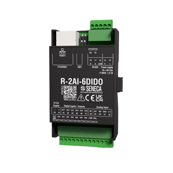 Le modèle R-2AI-6DIDO offre 2 entrées analogiques et 6 canaux numériques, chacun pouvant être configuré individuellement comme entrée ou sortie numérique. La configuration peut être réalisée via un serveur web HTML5 ou à l’aide de micro-interrupteurs (DIP switches). Grâce à l’outil SDD (Seneca Discovery Device), les utilisateurs peuvent facilement identifier et configurer l’adresse IP, l’adresse MAC et la version du firmware du module sur le réseau LAN.