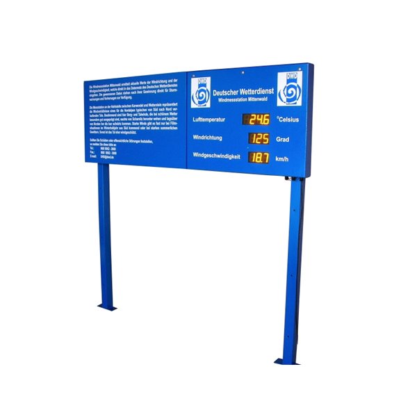 Nos écrans de plein air numériques sont adaptés pour une installation extérieure. Domaines d'application typiques sont en poids et de mesure des données, le nombre d'annonces, tachymètre, écrans de sécurité (par exemple jours de sans accident) et Camion systèmes d'appels. La hauteur de caractères peut être compris entre 60 et 500 mm, avec couleur chiffres rouge ou orange. Qui Luminosité chiffres est réglée automatiquement via un capteur de lumière.
