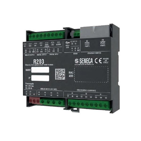 De fabrikant Seneca heeft zijn familie energiemeters uitgebreid met de R203, een bi-directionele energiemeter die zowel monofasige als driefasige verbruiken kan meten. De R203 heeft twee Ethernet poorten, hierdoor kunnen meerdere R203's via een daisy chain verbinding met elkaar communiceren, bij een defect in één van de modules valt de communicatie tussen de overblijvende modules niet weg. De R203 ondersteunt zowel Modbus RTU als TCP/IP en kan als passtrough dienen tussen de 2 protocollen, waarbij de module de opdrachten die binnen komen via Modbus TCP/IP kan doorsturen naar zijn RS485 aansluiting. Dankzij de datalogger functie kan de R203 metingen opslaan waarna deze kunnen geraadpleegd worden via de ingebouwde webserver, deze metingen kunnen worden doorgestuurd via Modbus, via een digitale pulsuitgang of een analoge uitgang.