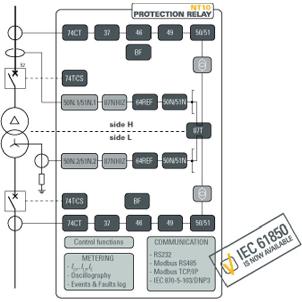 • ANSI protectie Negative sequence overcurrent (46)|Low impedance restricted ground fault (64REF)|Residual overcurrent (50N/51N)|Pt100 thermometric probes (26)|Phase undercurrent (37)|Thermal image (49)|Phase overcurrent (50/51)|Biased differential for transformer (87T)|Breaker failure (BF)|High impedance restricted earth fault (87NHIZ)